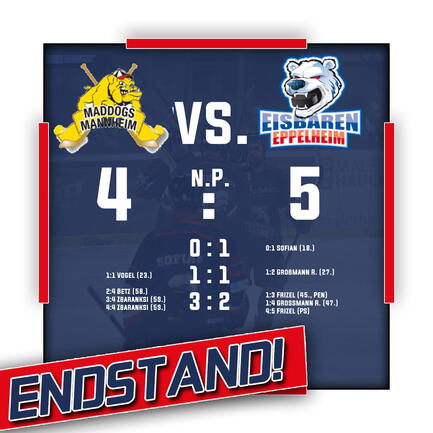 Als man im Schlussabschnitt bei 4 vs 4. erstmals etwas Platz hatte, gelang Frizel ein Durchbruch, vom Torschuss wurde er jedoch regelwidrig behindert. Den fälligen Penalty konnte er dann jedoch im Tor der Gastgeber unterbringen (45.) und die Eisbären wähnten sich auf der Siegerstraße. Denn nur gut zwei Minuten nach dem 1:3 konnte Großmann sein Debut mit einem Doppelpack veredeln und die Eisbärne mit 4:1 in Führung bringen. Die Mannheimer gaben sich jedoch nicht auf, investierten nun aber mehr in die Offensive, die sie zu gefährlichen Chancen kommen ließen, während die Eisbären die sich nun bietenden Konterchancen nicht sauber zu Ende spielten. Doch etwas überraschend kam Mannheim gut zwei Minuten vor dem Ende zum zweiten Treffer des Abends und sollte eine nicht mehr zu erwartende Wende einläuten. Ein Fehler in der Defensive sorgte für den nächsten gefährlichen Torschuss der Mad Dogs, der zum 3:4 (59.) einschlug. Die Gastgeber setzen nun alles auf eine Karte und nahmen den Torwart vom Eis - mit Erfolg. Nur 45 Sekunden nach dem Anschlusstreffer gelang es das Spiel zu egalisieren (59.). Die Eisbären zeigten sich nun taumelnd und hätten um ein Haar den Siegtreffer schlucken müssen, doch mit Glück gelang es das Spiel offen zu halten, während man kurz vor der Schlusssirene selbst noch den Siegtreffer auf dem Schläger hatte.