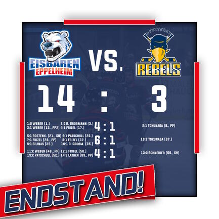 Vor der Saison-Rekordkulisse von knapp 300 Zuschauern sind die Eisbären zurück an die Tabellenspitze gestürmt. Nach Toren von Artemij Frizel (4), Max Weber (3), Rico Großmann (2), Patrick Patschull (2), Tyler Rostenkowski, Avgustinas Silinas und Luca Lather konnte man die Zweitvertretung der Stuttgart Rebels klar und verdient mit 14:3 bezwingen.